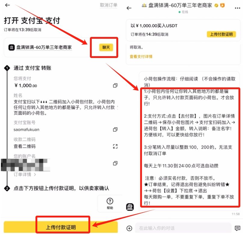 这个时候订单就生成了,我们可以点击【聊天】这里,看一下商家有哪些要求。比如说实名付款,不要备注等等。确认没有问题之后,我们就可以离开平台,打开支付宝,通过这里商家提供的支付宝账号和他的收款二维码,去给他进行转账。转账完成之后记得截一下图,然后回到平台上传一下付款证明。提交之后商家那边确认收到了钱,就会把币放给我们了。这样我们就会完成一个入金的流程了。
