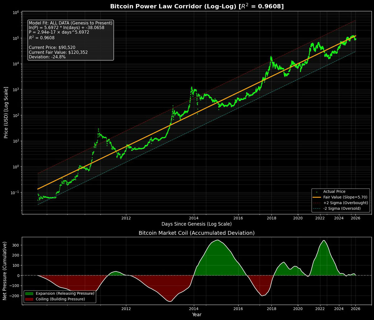 比特币熊市仍在持续,2026年初价格徘徊于9万美元附近,市场情绪疲软,机构资金流入放缓,幂律模型由富达全球宏观总监于2026年1月10日重申,将6.5万美元视为关键趋势底线与生…
