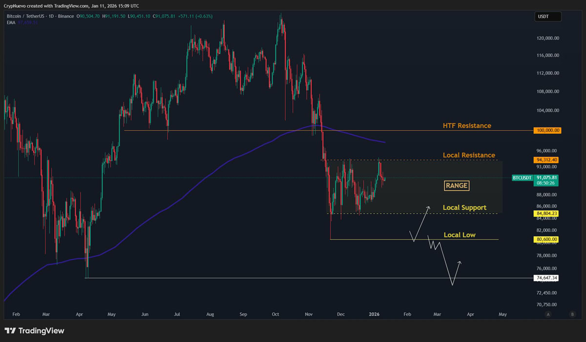 在更高周期上,交易员CrypNuevo将注意力放在97,400美元的50周指数移动均线(EMA)上,认为在出现新低前这可能是潜在上行目标。