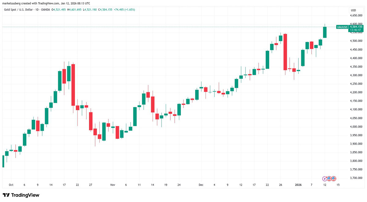 声明公开后,股指期货立即下跌,黄金则触及每盎司美元4,601的历史新高。