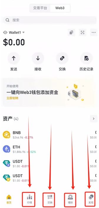 我们来看一下这个钱包有哪些功能。首先能够看到下面的行情、交换、理财和发现。