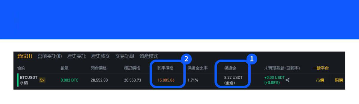 永续合约最常见的风险就是「爆仓」,也可以称其为「清算」(Liquidate)或「强制平仓」。意味着开单(建仓)后亏光了保证金(标示1),使该单被强制结算关单。会触发爆仓的价格标示在「强平价格(标示2)」,让我们能提前注意币价是否即将触及爆仓门槛,适时补充保证金或止损。