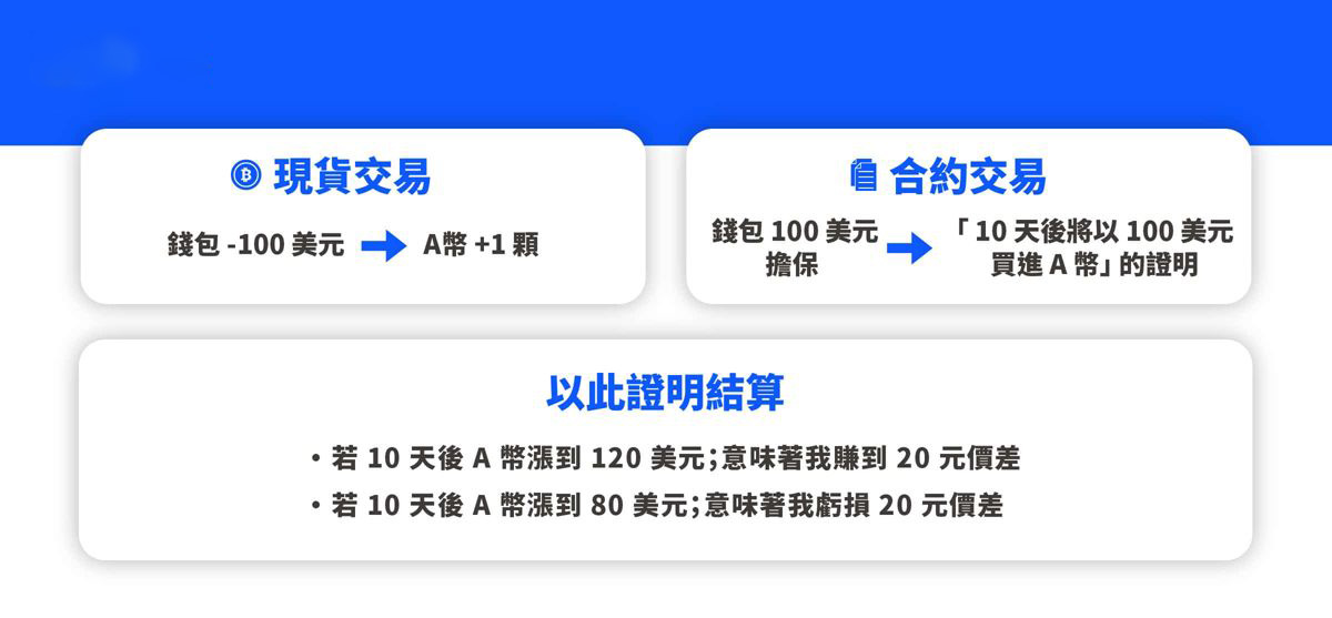 举例来说,若我用100 美元购买1 颗A 币现货,意味着我的钱包少了100 美元,并且多了1 颗可以自由转移、贩售、支付的A 币。若我用100 美元购买A 币10 天后到期(结算)的期货合约,意味着我持有一份「在10 天后以100 美元买进A 币」的证明,若10 天后A 币涨到120 美元,我可以拿着这个证明结算(平仓)获利20 美元。反之若10 天后A 币跌到80 美元,此时结算(平仓)将亏损20 元。