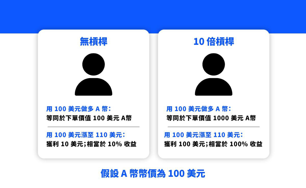 若我们用100 美元10 倍做多A 币,代表我们仅用100 美元就下单了价值1000 美元的A 币。假设一颗A 币价格原本为100 美元,当A 币上涨至110 美元,意味着A 币上涨了10%,此时我们价值1000 美元的A 币,现在价值1100 美元,结算时可获利100 美元。