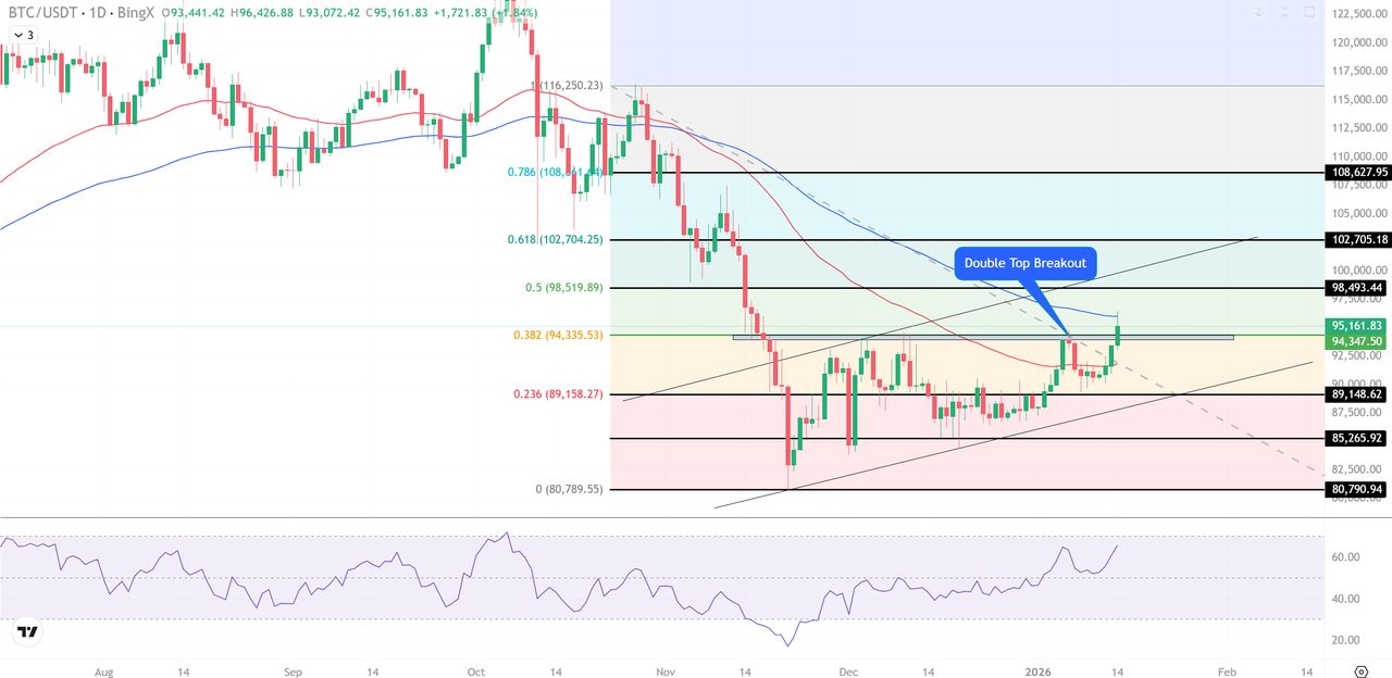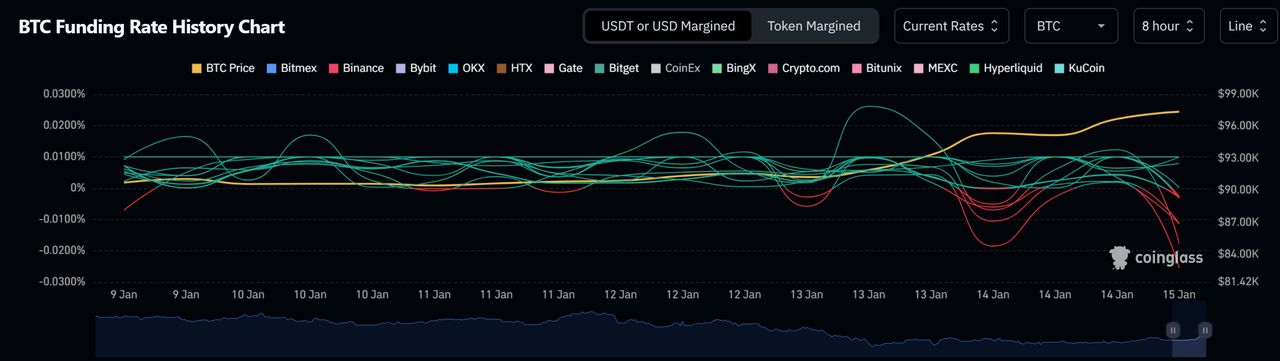 比特币价格首先作出反应。BTC从92,000-93,000美元附近的盘整区间突破,飙升至96,000-98,000美元,标志着几周以来最强劲的涨势。但涨势的速度不仅仅由现货需求驱动。它是由衍生品仓位驱动的。