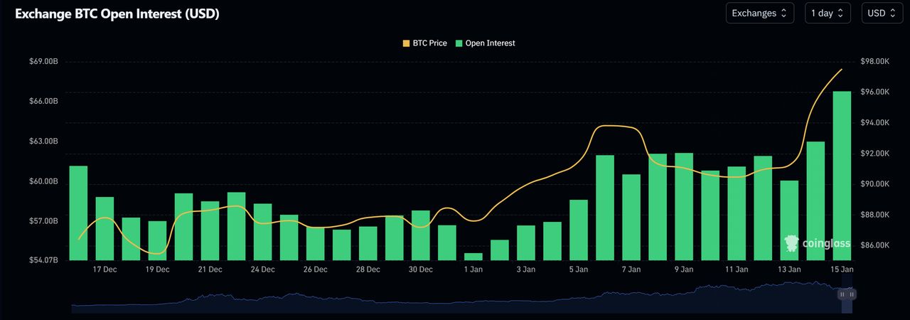 • 持仓量上升:显示交易者正在增加杠杆而不是退出。如果价格停滞而持仓量继续攀升,仓位变得过度集中。