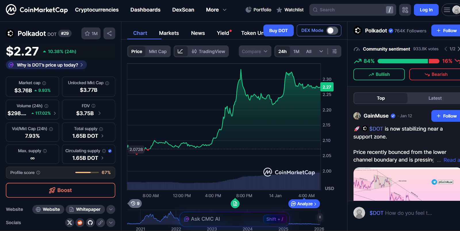 预计到 2026 年,Polkadot 的市值将接近 130 亿美元,并拥有积极的治理参与度。DOT 持有者可以对升级进行投票,从而确保决策由社区驱动。其生态系统支持金融、身份和数据相关的项目。这种多样性增强了其长期应用前景。