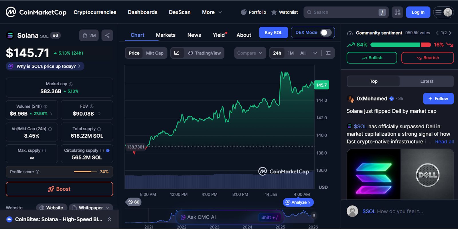 就市场地位而言,以太坊继续在智能合约领域占据主导地位。截至2026年1月,ETH的交易价格约为2520.99美元,估计市值接近3842.7亿美元,使其成为仅次于比特币的第二大加密货币。该网络保障了数千亿美元的链上价值,并支持数千个活跃应用进程,同时以太坊二层解决方案处理着日益增长的交易量。这些因素使以太坊稳居最佳投资山寨币之列,无论是散户投资者还是机构投资者都对其青睐有加。