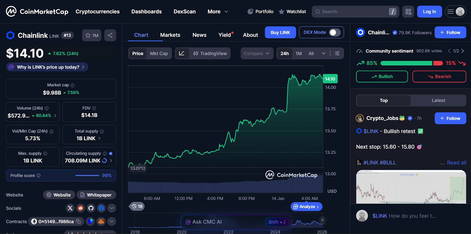 要理解Chainlink是什么,可以把它想象成区块链与现实世界之间的桥梁。截至2026年1月,Chainlink的市值约为94亿美元,这得益于数百个协议的持续需求。它得到了大多数主流区块链的支持,并受到需要安全数据的开发者的信赖。这种广泛的认可降低了对任何单一生态系统的依赖。
