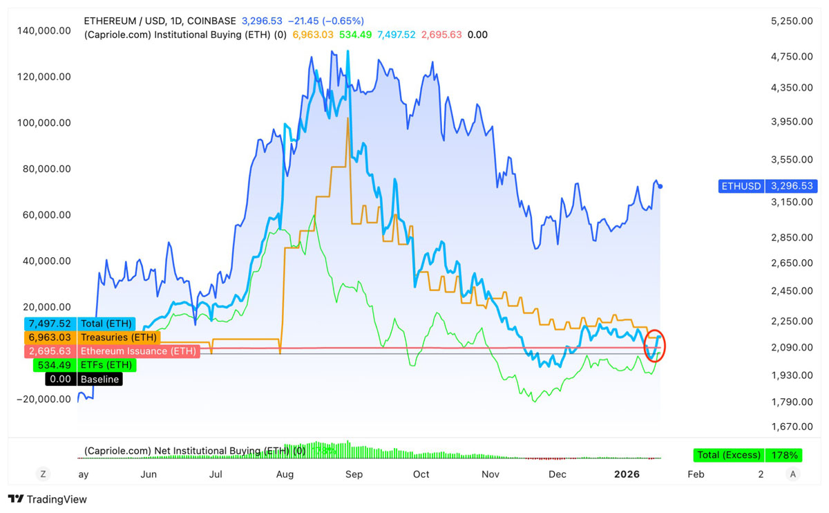 根据Capriole Investments的数据,每日机构买入量(包括DAT和ETF)也已升至每日净买入6,964 ETH。