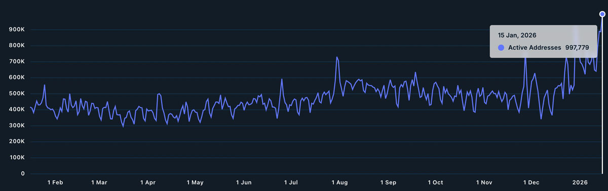 根据Nansen的数据,以太坊的网络活动持续表现强劲,过去30天内活跃地址增加了53%,1月15日达到28个月以来的最高水平,为995,779个。