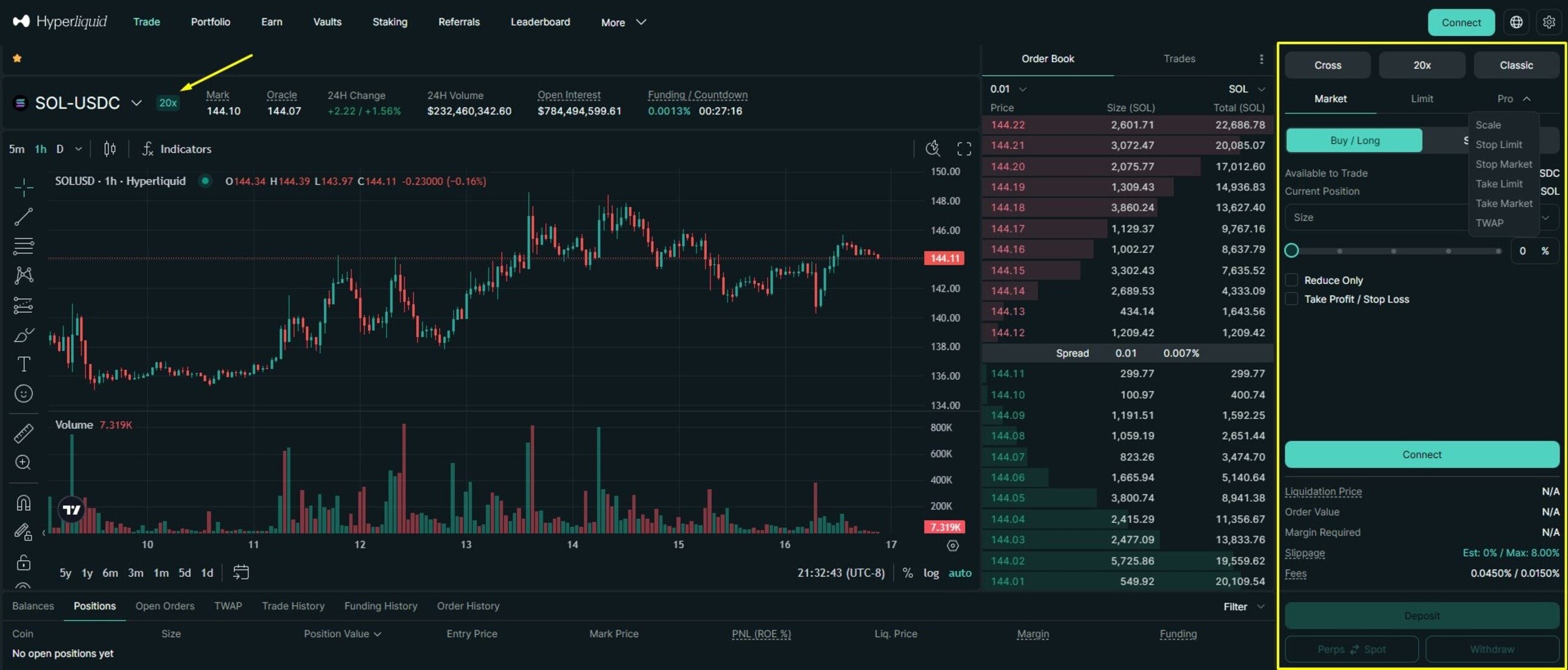 步骤三:开始交易或质押:您可以选择现货交易、永续期货交易或将资金存入 HLP 等金库。每种方式的风险和回报各不相同。