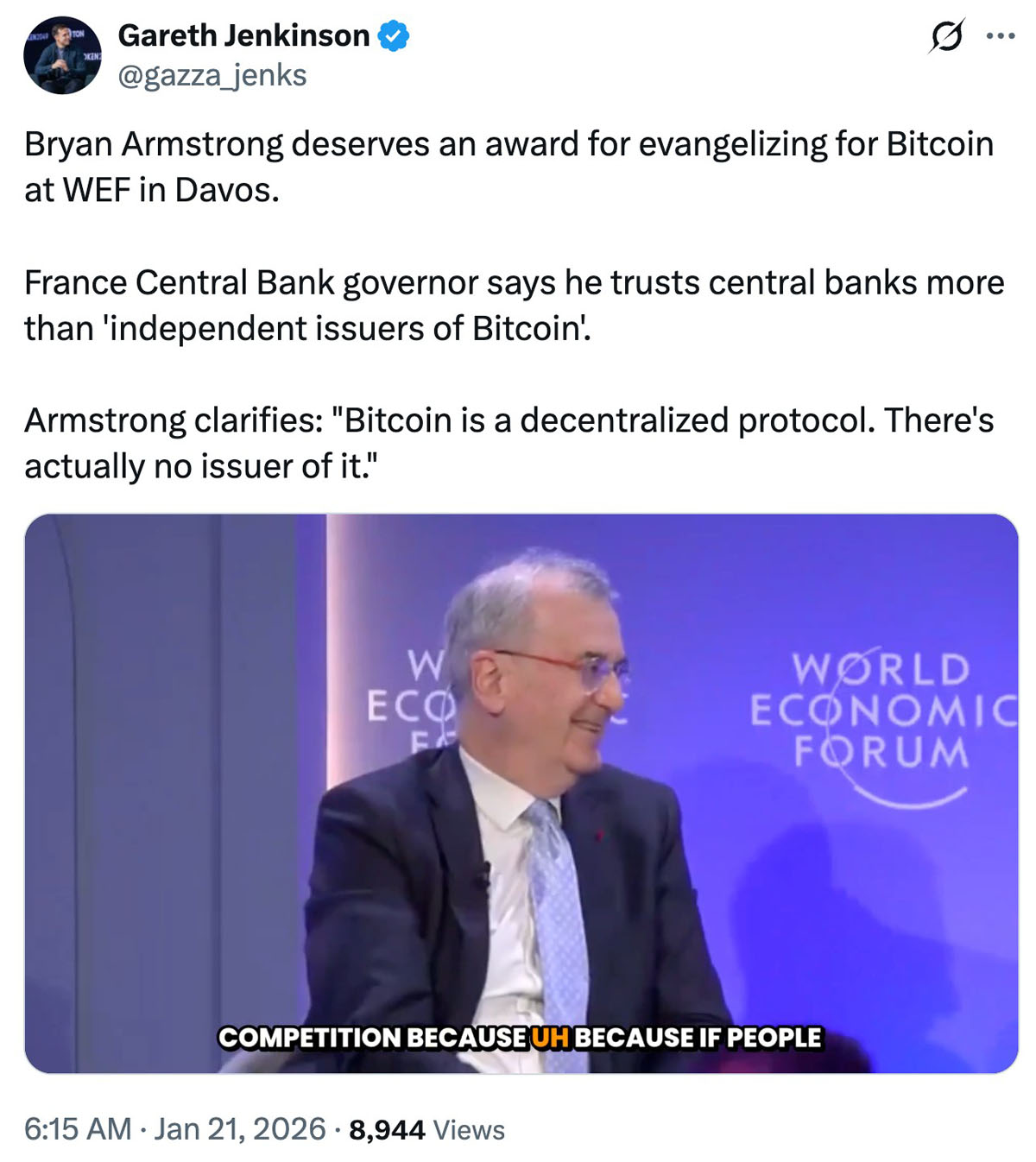 在达沃斯世界经济论坛上,法国央行行长与Coinbase首席执行官就货币的信任来源是来自机构还是去中心化的比特币展开了激烈争论。