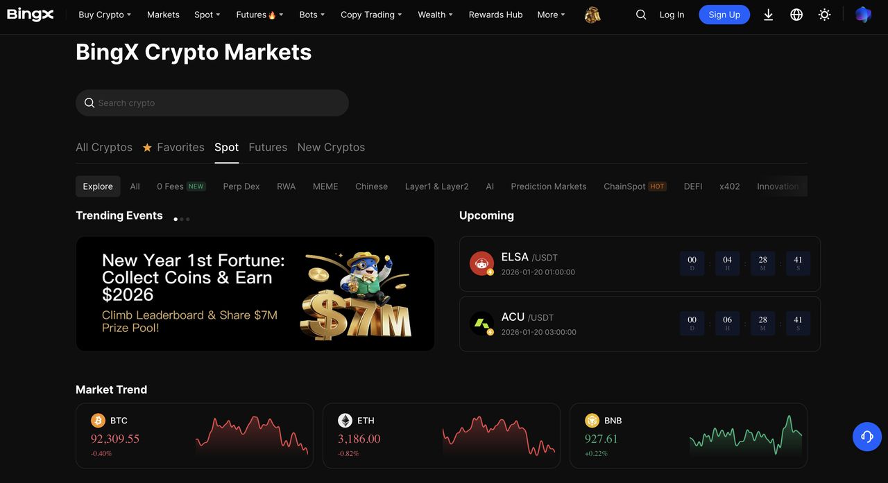 BingX凭借深度集成的BingX AI生态系统站在2026年现货交易的最前沿,该系统提供实时市场洞察、自然语言查找回应和自动化策略优化。该平台列出超过1,000种加密货币,涵盖超过1,120个现货交易对,包括BTC/USDT和ETH/USDT等主要币种,以及经常以临时零手续费促销推出的新代币。