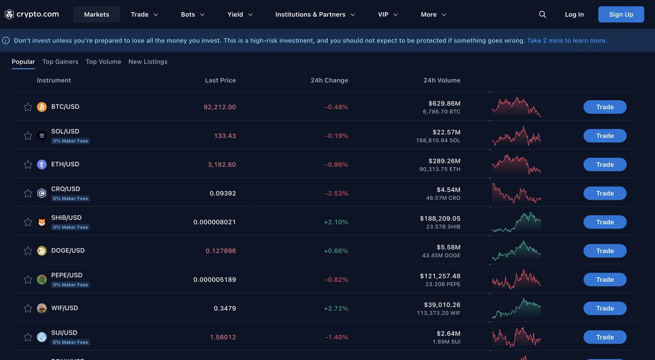 Crypto.com通过ACH、电汇或指定方法提供零手续费美元存款,提供完美的现货交易体验,并支持超过400种加密货币,包括比特币、以太坊和广泛的稳定币。该交易所在2025年产生了1.3万亿美元的现货交易量,得到内置交易机器人(如定期定额投资和网格策略)强劲采用的显著帮助。