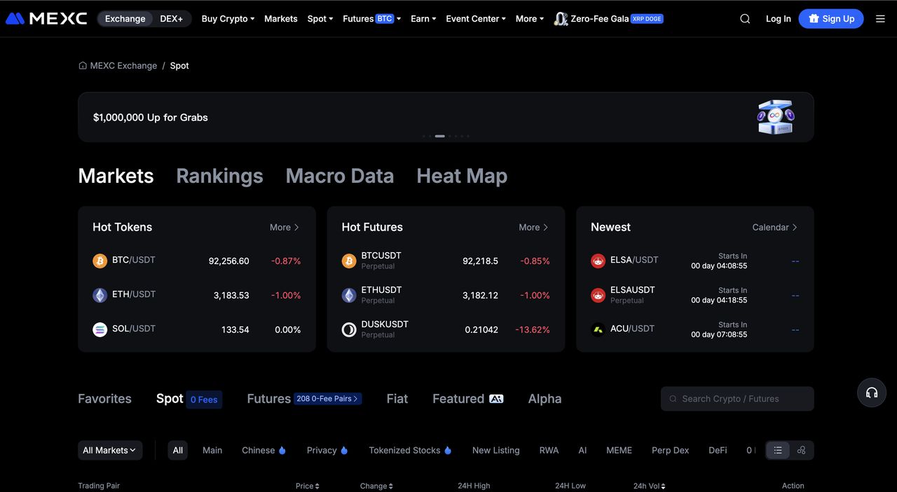 MEXC专精于山寨币多样性,列出超过3,000种加密货币和数千个现货对,同时收取0%做市商和吃单者手续费,通过持有MX代币可获得额外折扣。该平台在2025年实现了1.4万亿美元的现货交易量,受到1亿美元守护者基金和1:1储备证明的保护。频繁的迷因币发布、空投活动和促销零手续费交易期继续吸引寻找高潜力机会的活跃交易员。