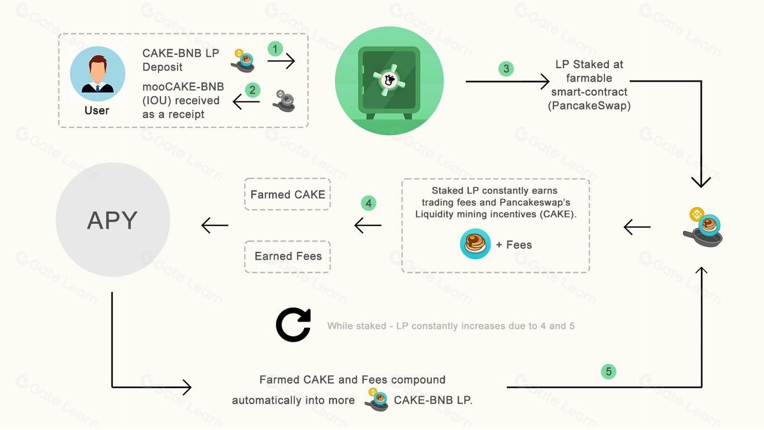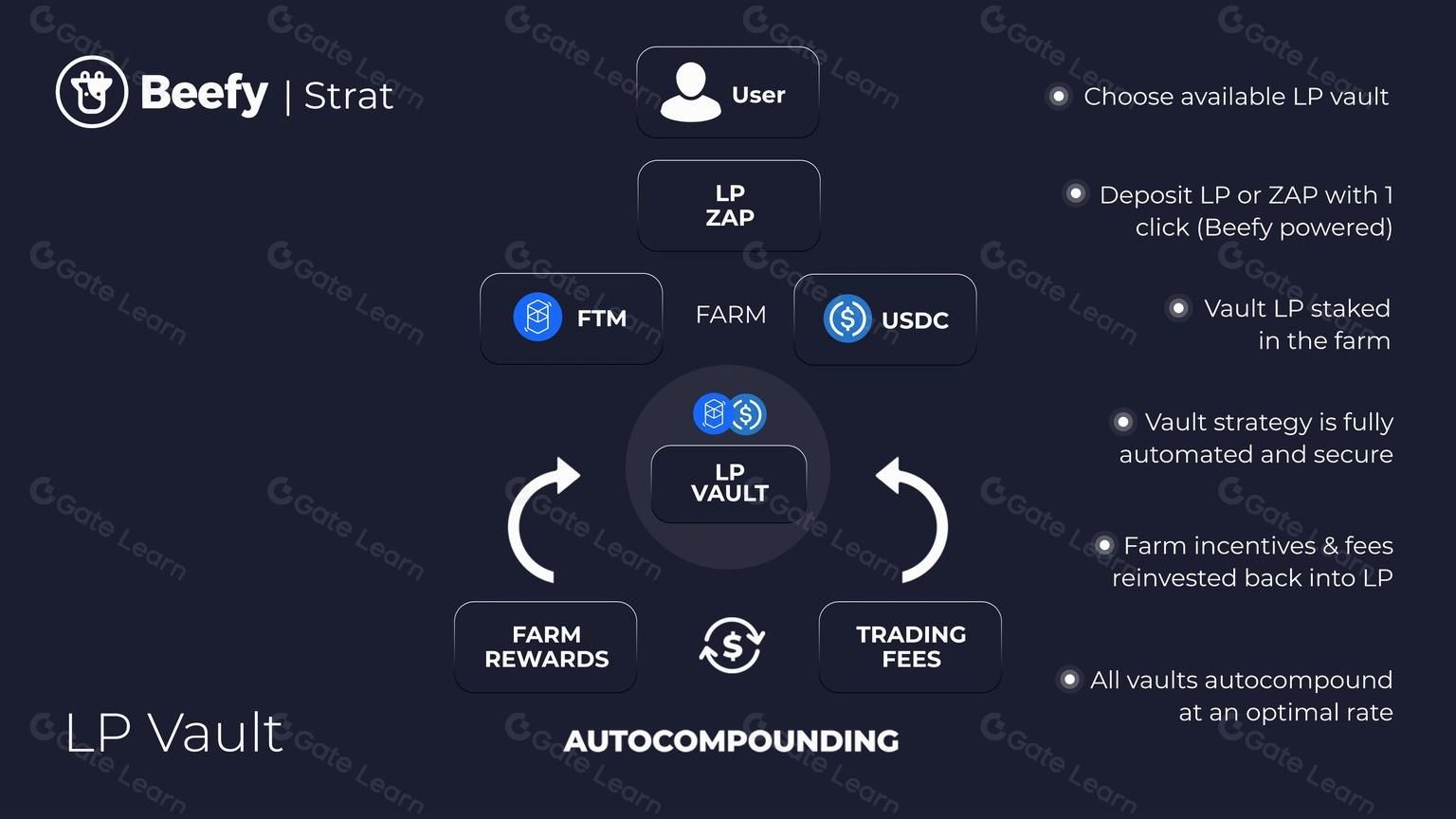 在 Beefy 金库中,用户可以赚取更多他们所质押的资产,无论是流动性池 (LP) 代币还是单一资产。例如,在金库中质押 BTC-BNB LP 代币将随着时间的推移获得更多的 BTC-BNB LP 代币,这实际上增加了用户在流动性池中的份额,并允许获得更多的费用和奖励。尽管被称为 “金库”,但用户资金实际上从未被锁定,并且可以随时提取。Beefy 协议并不拥有存入金库的资金,而是通过复利的力量实现收益最大化,使其成为中长期投资的理想选择。