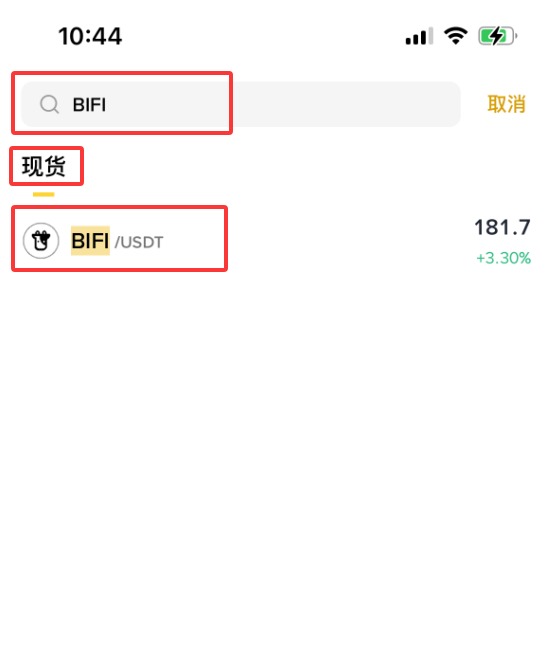 3、输入【BIFI】,这时下拉会显示【现货】【BIFI/ USDT】,点击【BIFI/ USDT】。(作为新手,不建议做合约,所以这里就不演示合约购买方式了。)