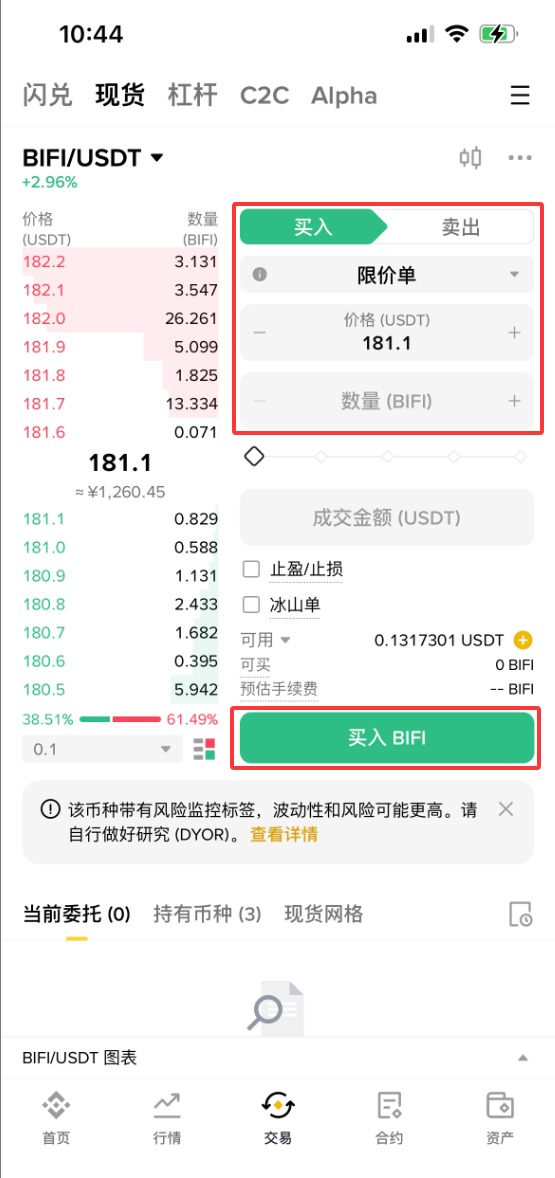 5、依次选择【限价单】-购买【价格】-购买【数量】-【成交数量】,设置好之后,点击【买入BIFI】。