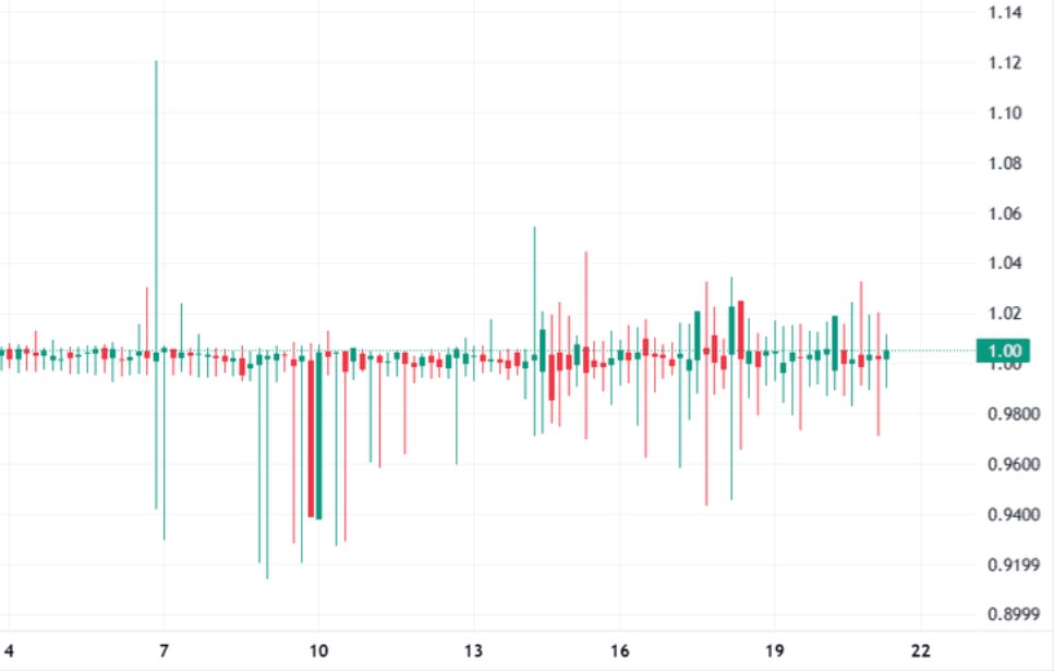 这种行为是挂钩稳定资产的特征,而不是由动量交易驱动的投机代币。若干可见的上下尖刺并不代表持续的价格波动。