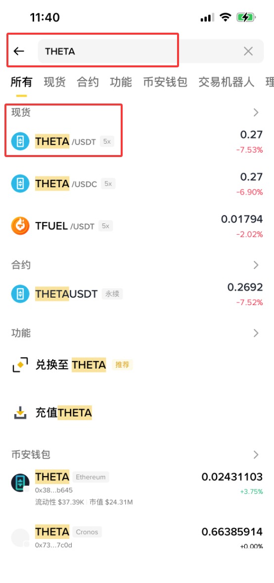 3、输入【THETA】,这时下拉会显示【现货】【THETA/ USDT】,点击【THETA/ USDT】。(作为新手,不建议做合约,所以这里就不演示合约购买方式了。)