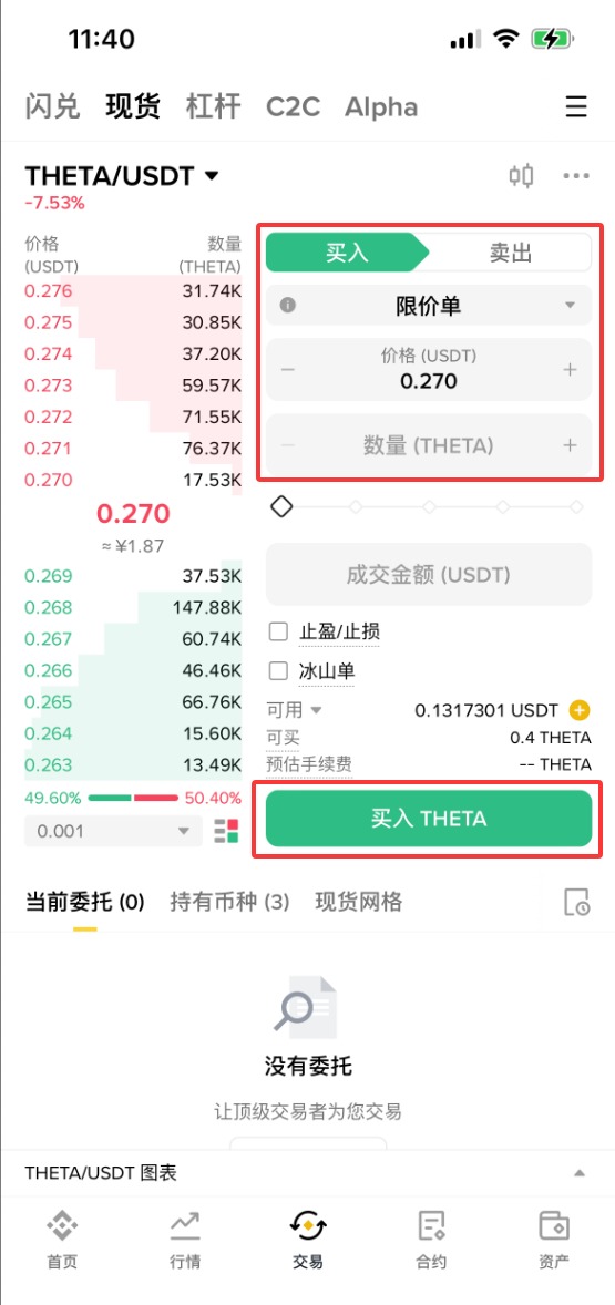 5、依次选择【限价单】-购买【价格】-购买【数量】-【成交数量】,设置好之后,点击【买入THETA】。