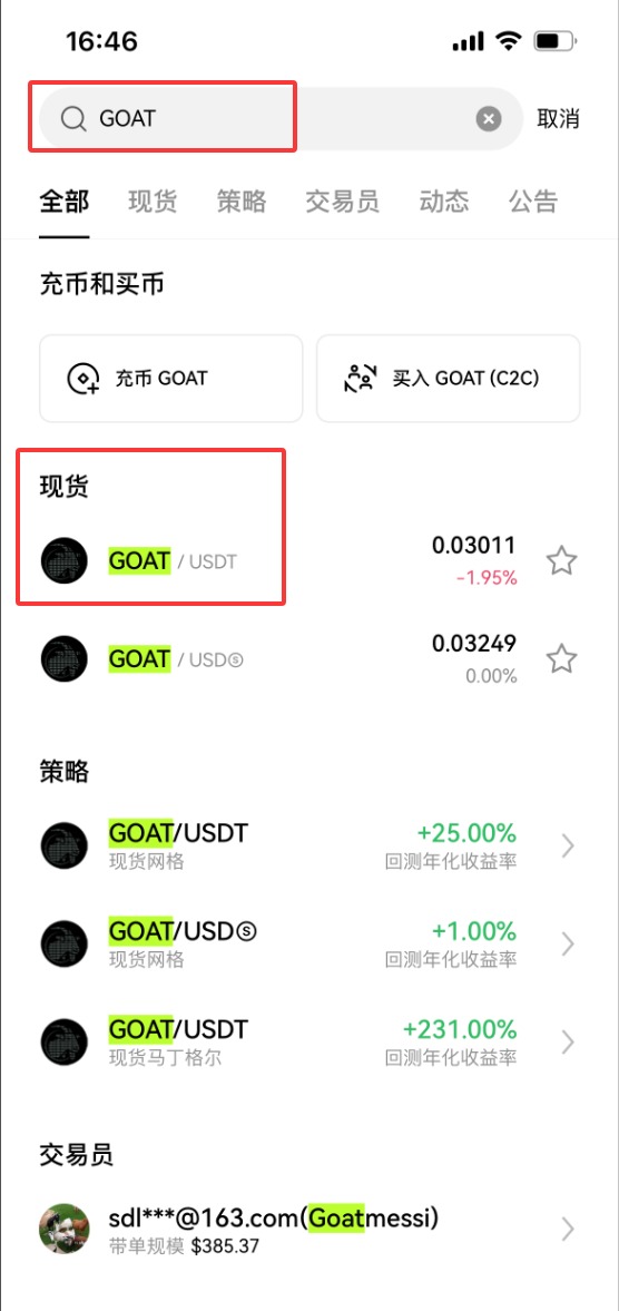 3、在搜索框里输入【GOAT】,这时下方会出现GOAT/ USDT,选中它。