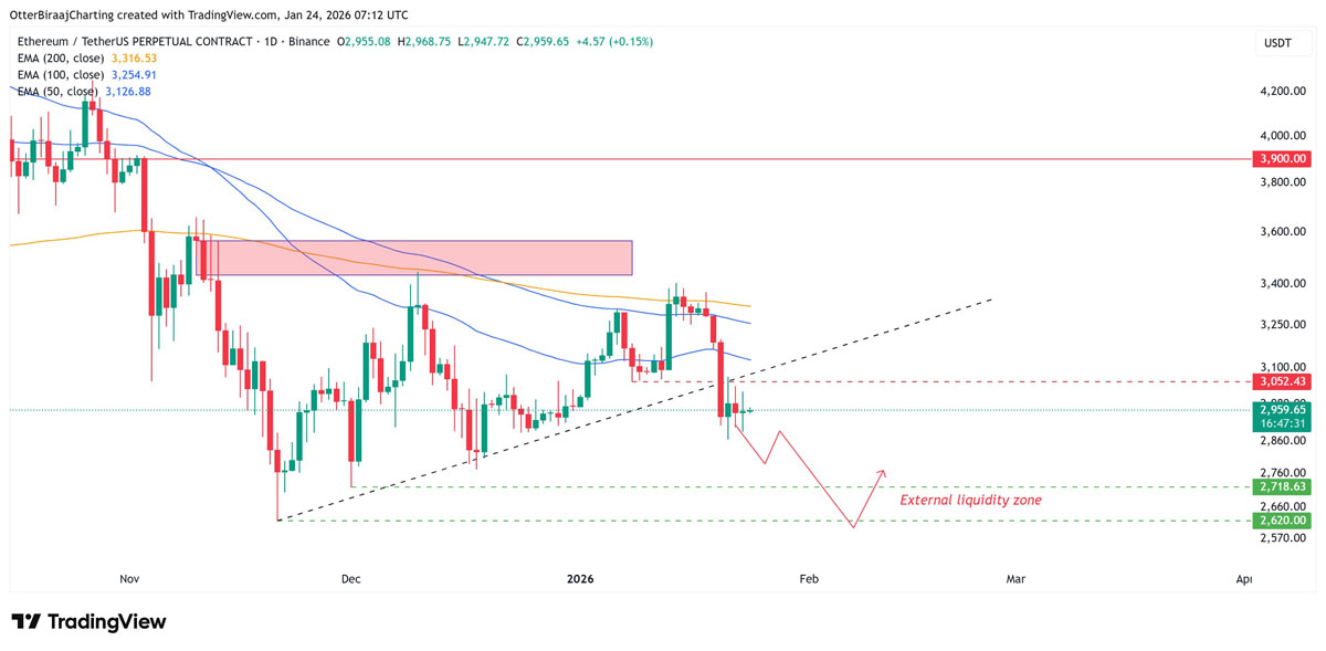如果以太坊再次回探这一区域,分析师预计下行空间可能仅限于约7%,潜在的局部底部将位于2,720美元附近。这一水平也与外部流动性区域相吻合,若受到测试,更有可能引发趋势性反应。