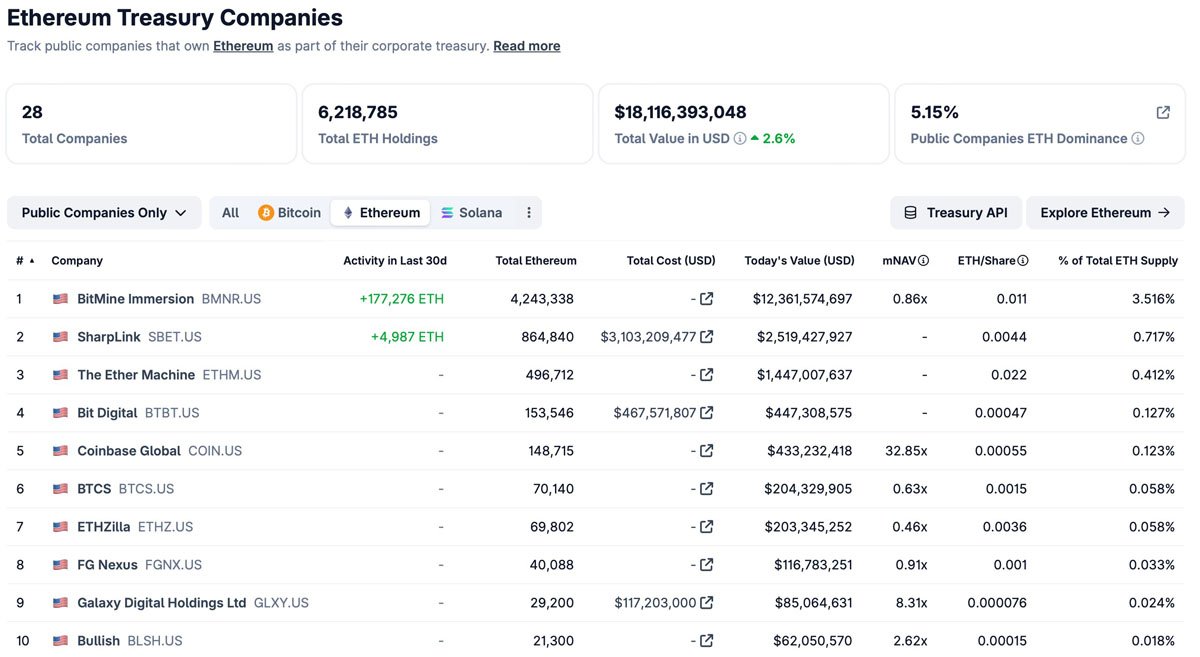 公开交易的以太币国库已质押超过200万枚ETH,总持有量超过420万枚,占流通供应量的3.5%。