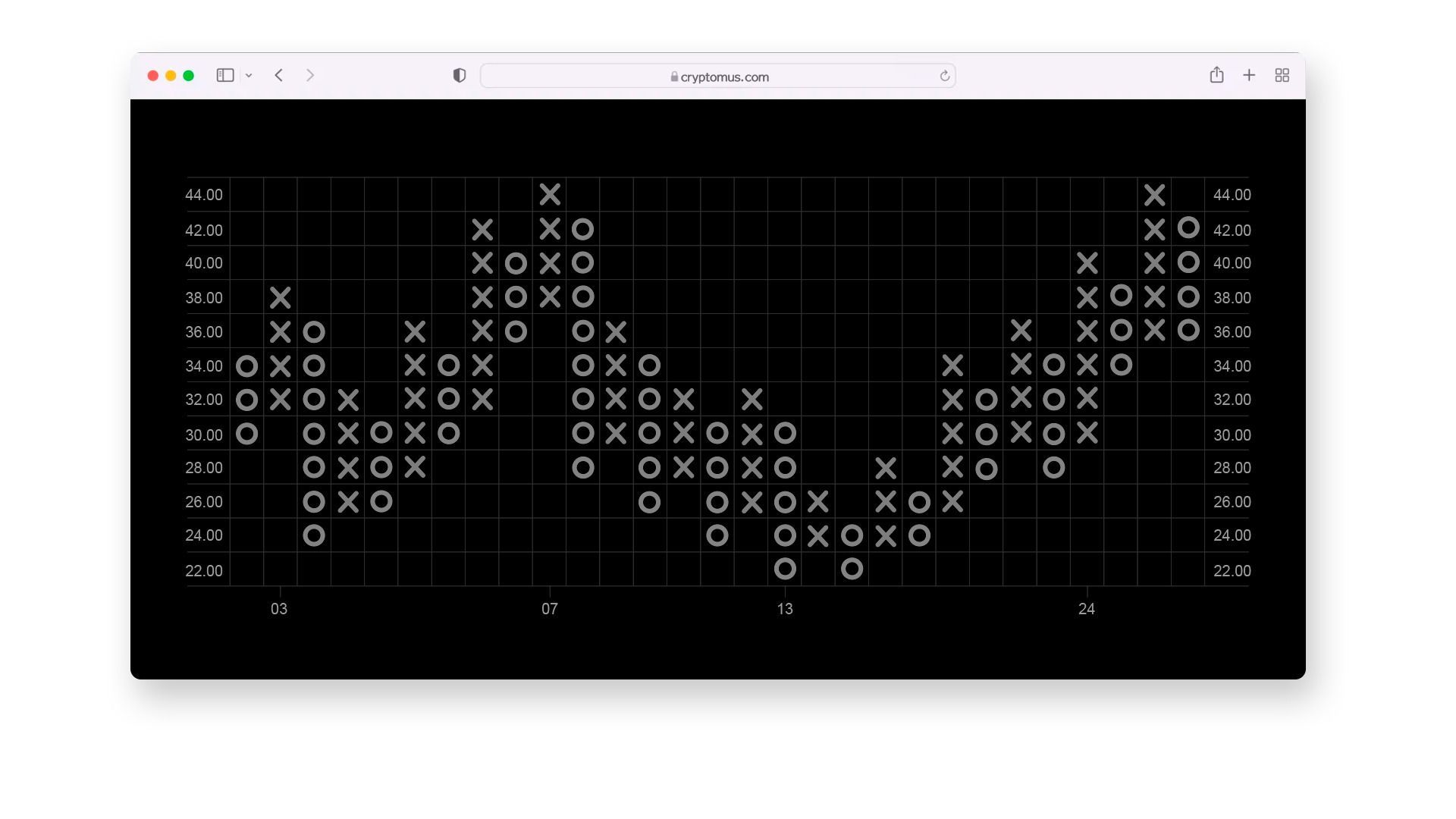 与其他图表类型不同,点线图只专注于显着的价格变动,过滤掉小幅波动,并完全忽略时间。该图表使用"X"表示向上移动,"O"表示向下移动。结果是供需关系清晰可见,更容易发现突破和反转。