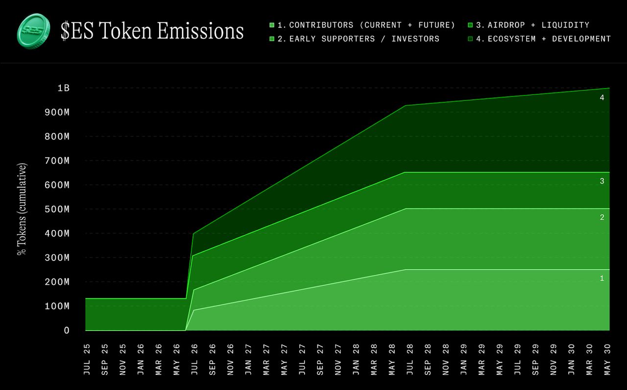 - 空投和流动性: 100% 的初始 1.5 亿 ES 于 2025 年 7 月 16 日的代币生成活动 (TGE) 中解锁,以启动即时的网络活动和交易。