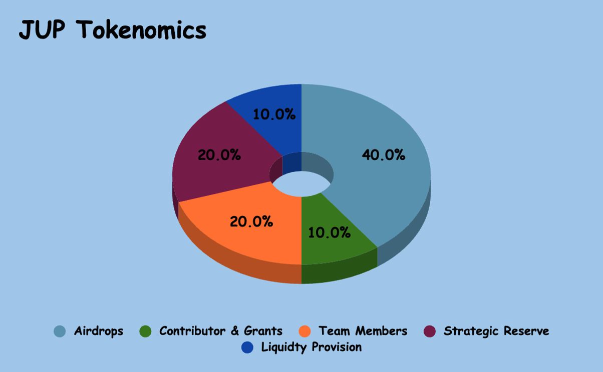 - 社区激励: JUP 代币总供应量的很大一部分(100 亿总供应量中的 40 亿代币或 50%)将通过定期空投分配给社区。这旨在奖励现有用户的参与和支持,并激励进一步参与 Jupiter 平台。