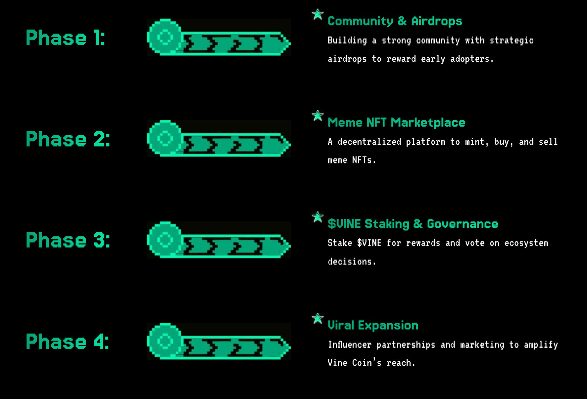 Vine Coin($VINE)制定了一条明确的发展路线图,以推动项目发展并增强社区互动。该路线图分为四个阶段,每个阶段都专注于特定目标,以完善生态系统并扩大影响力。
