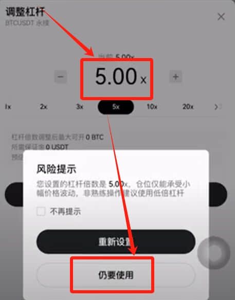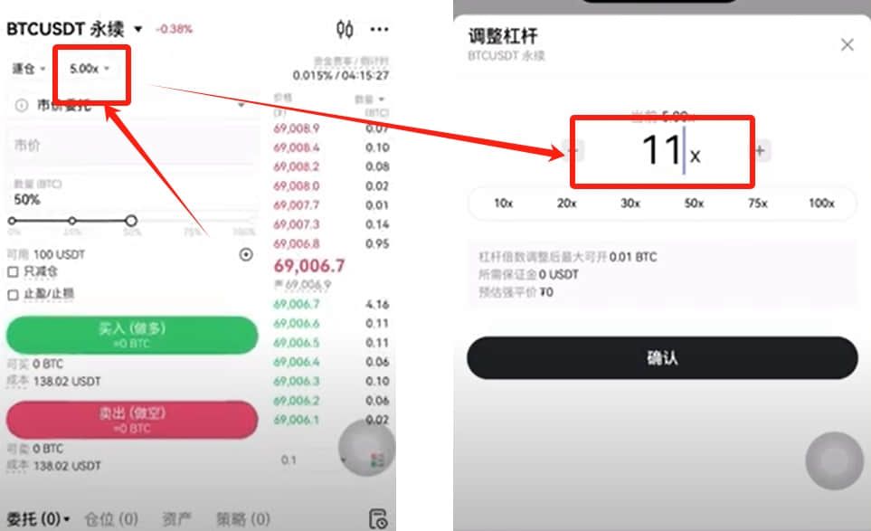 我们继续看右边的倍数。这里5.00X它就是代表了一个5倍的杠杆。我们点击进去,这里有很多的倍数,我们也可以手动输入一个倍数。比如说我们输入个11,那这就是11倍了。建议大家如果想试一试30倍、50倍、100倍杠杆的话,也是选用一个小资金的去玩,因为你起码要搞懂其中的风险。倍数高你赚的多,但是亏的也很快。50倍的话你赚当然是赚50倍,但是市场与你开的方向相反,做出2%的波动,那么你的单子就会被爆掉。