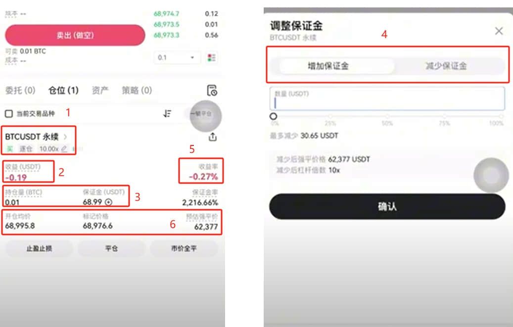 “持仓量”、“保证金”,保证金后面有一个小加号点击一下,你可以在这里增加保证金,你也可以减少保证金。比如说你右方这里的收益率已经-95%了,在爆仓的边缘。但是你觉得后续它会涨。那么你可以增加你的保证金。不让这个单子爆掉。还有“开仓均价”、“标记价格”、“预估强评价”,预估强评价就是一个预估的爆仓的价格。