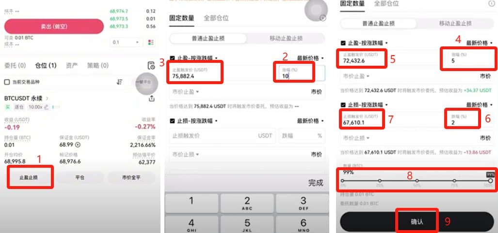 在这里我们下单的时候先不勾选止盈止损。在这里也可以设置一个止盈止损。点击“止盈止损”,你可以按照涨跌幅设置价格也是非常好的。比如说止盈如果涨幅10%,我们的价格就翻倍了。它会自动计算出来一个止盈的BTCUSDT价格75000有点太过分了。我们更改个涨幅5%,我们就获利72000。选择“市价”。跌幅这里跌多少我们来结束,如果跌10%的话,我们整个本金都会爆掉。这里我们设置一个2%,到67603就会触发,选择数量,可以直接给他拉满,点击【确认】。这样一个普通的止盈止损就设置成功了。我们还可以继续添加别的方案,以后再给大家详细的说。