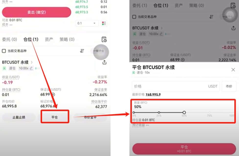 继续回到这个页面,下方有一个“平仓”。这里我们可以选择平仓的数量。比如说这一个单子这时候你已经加100%了,这个单子已经翻倍了。那么你可以选择平仓掉50%的数量。把你的本金取出来。让它的利润继续跑。这也是一种交易方式叫做部分止盈。我们把本金剔除出来。让利润继续奔跑,赚的越多越好,亏了我们也不心疼。这也是一个平仓的策略。