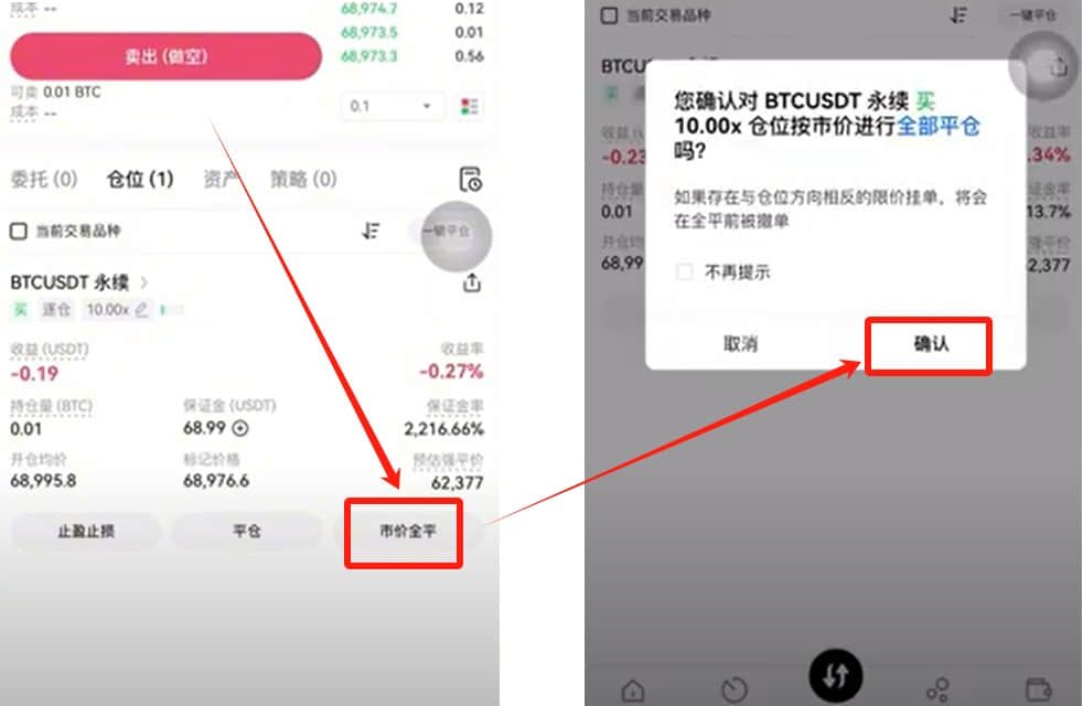 后面还有一个“市价全平”。就是你现在不想要这个单子了,你想要把它全部平掉,就可以选择市价全平。然后点击【确认】就可以了。