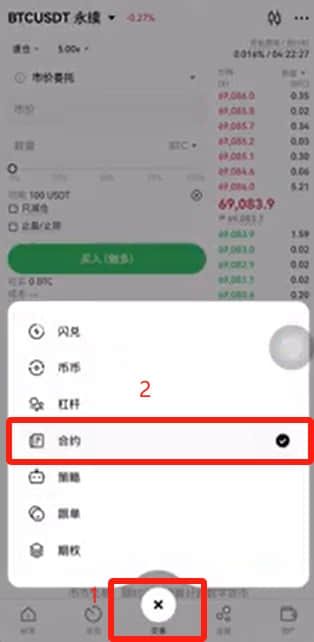 我们进入欧易APP之后,连续点击两次下方中间的黑色交易按钮,会弹出来 一个选择界面。在这里我们选择【合约交易】。