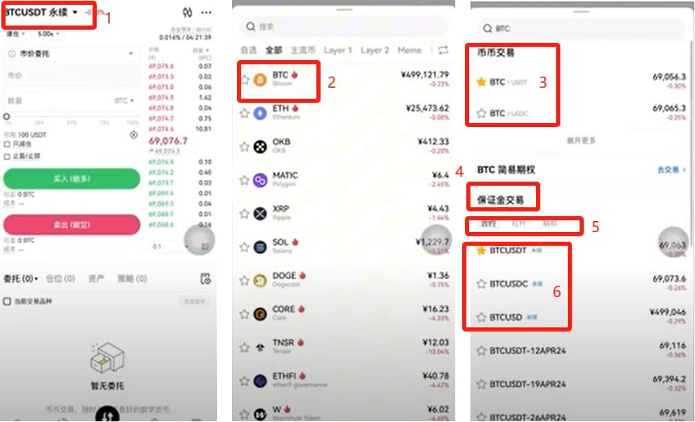 那么在这个界面首先我们要知道我们交易的是什么币。左上角可以看到“BTC/USDT永续”,点击进去,我们就以比特币为例子。大家想开别的币单子的话,就在这里搜索别的币也是一样的。点击这里的比特币,上方是币币交易,往下划到“保证金交易”。再往下他这里有合约、杠杆、期权,我们选择“合约”,上方的三个就是比特币的永续合约。他们分别是“BTC/USDT永续”、“BTC/USDC永续”、“BTC/USD永续”。