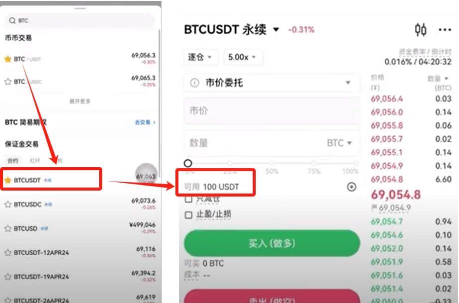 大部分做合约的交易员或者是投资人。他们其实会更想清楚的知道我的亏损,我的收益到底是多少钱。所以我们会习惯使用U本位。在这里我们就选择“BTC/USDT永续”合约,他就是U本位的。那我们就以U本位比特币交易对来做演示。这个页面左上角有一个“逐仓”。这是一个保证金的模式选择,一个全仓,一个逐仓。