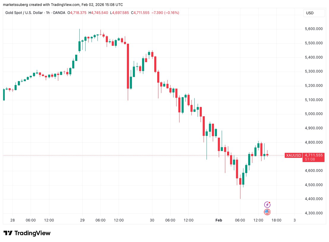 XAU/USD近期自历史高点大幅回落,试图在每盎司4700美元左右企稳。