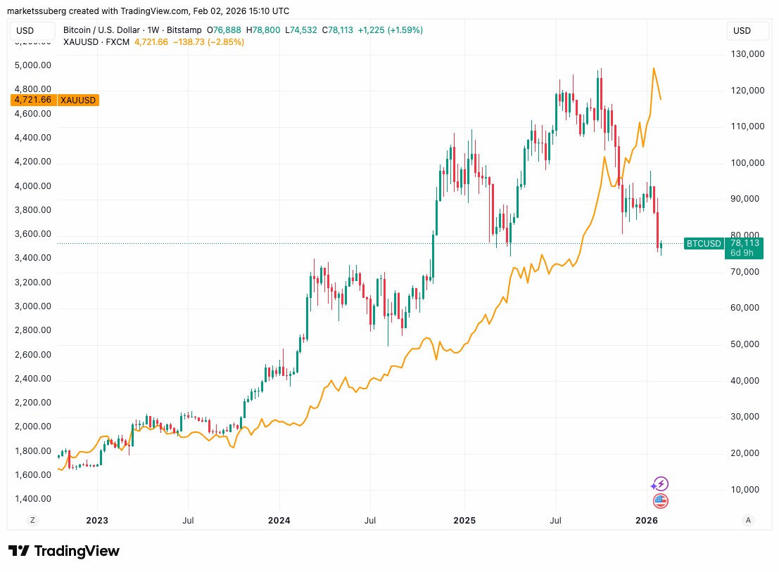BTC/USD与XAU/USD周线图。来源:Cointelegraph/TradingView