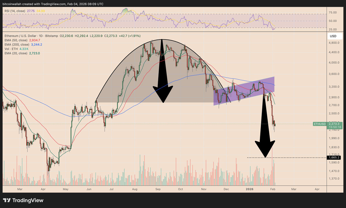以太坊原生代币ETH价格在2月份存在跌破2000美元风险,因经典看跌模式正在形成。
