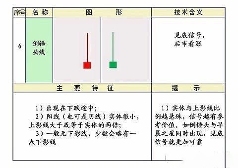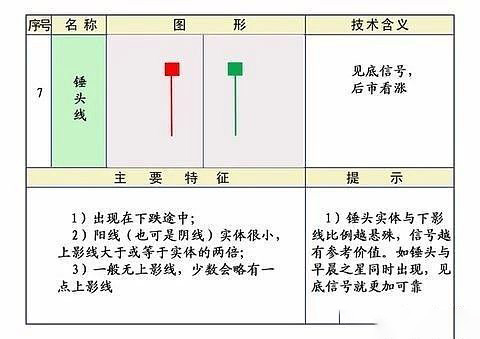 - 1、寻找“锤子线”形态,它出现在下跌过程中,具有小实体和极长的下影线,表明卖方尝试打压但被强劲买盘推回,是潜在的底部信号。