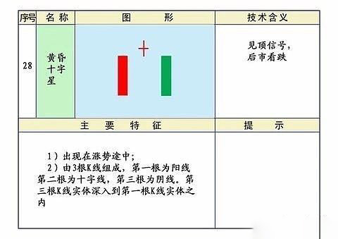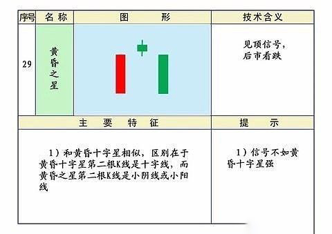 - 3、发现“黄昏之星”组合,此为顶部反转信号,包含一根大阳线、一根小实体星线和一根大阴线,第三根阴线收盘深入第一根阳线实体一半以下时信号更可靠。