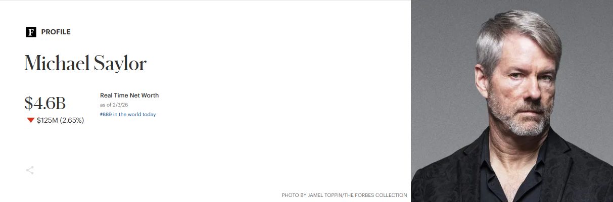 截至2026年2月初,据Forbes实时数据显示,Michael Saylor的净资产估计约为47亿美元。这一数字代表一个高敏感度估值,作为更广泛数字资产市场表现的实时代理。