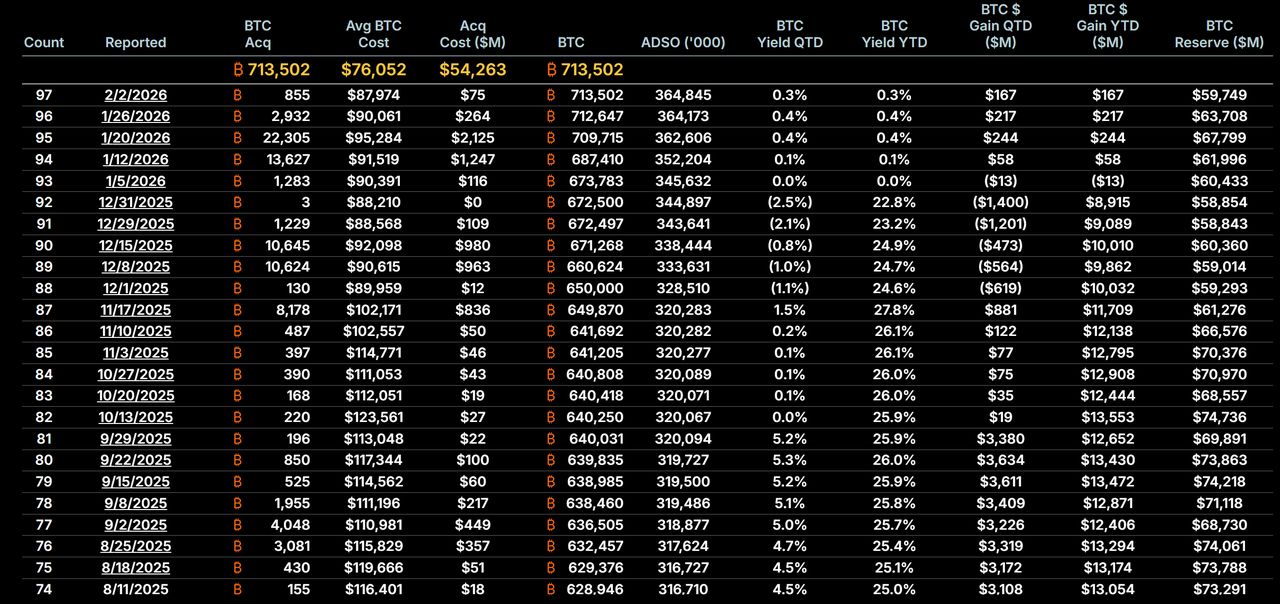 2026年2月第一周为Saylor的策略提供了戏剧性的压力测试。在急剧市场调整后,比特币跌至72,000美元范围,短暂地将Strategy Inc.的大量资产推入「水下」。