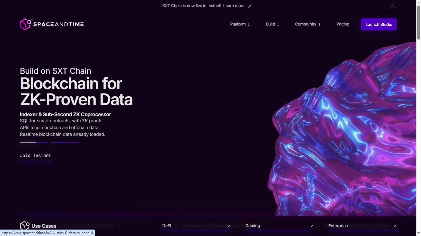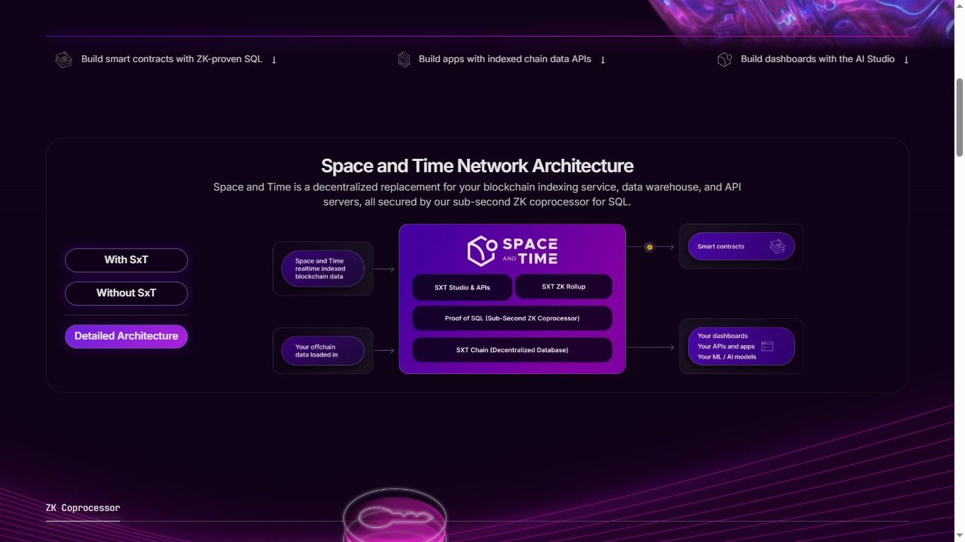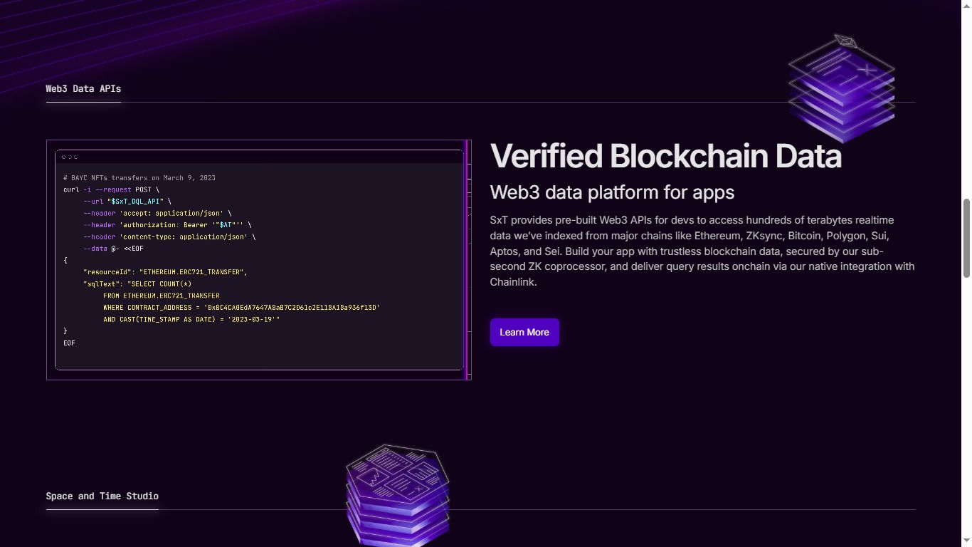 Space and Time(SXT)为开发者提供预构建的 Web3 API,这些 API 能将经过 ZK 验证的实时区块链数据注入应用。开发者还可以通过单一查询,将区块链数据与其平台数据集成。