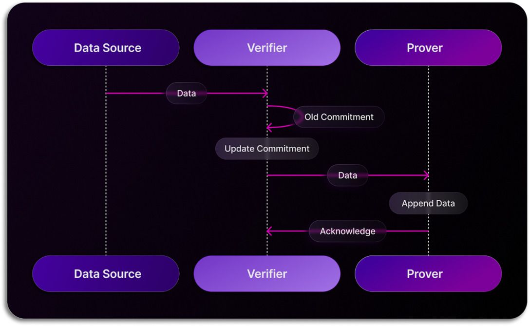 验证者和证明者以两种不同方式进行交互:数据摄取(Data Ingestion)和查询请求(Query Request)。在数据摄取中,该过程涉及客户端提交数据以纳入数据库。数据被发送到验证者,验证者生成一个包含足够信息的承诺(commitment),用于抑制协议中的信息篡改。